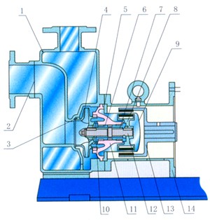 (2)ZCQ磁力驅動自吸泵結構設計一般由電動機、磁力耦合器和離心泵組成,其主要特點是使用磁力耦合器傳遞動力,當電動機股動磁力耦合器外磁轉子旋轉時,磁力線穿過空隙和阻隔套-作用于內磁轉子上,使泵轉子與電動機同步旋轉,無機械觸摸地傳遞扭矩,在泵軸的動力輸入端,因為液體被關閉在停止的阻隔套內,沒有動密封,因而流體徹底在密封腔內,沒有外泄的縫隙,因而,完成了關閉的全過程,到達了無走漏的技能需求。